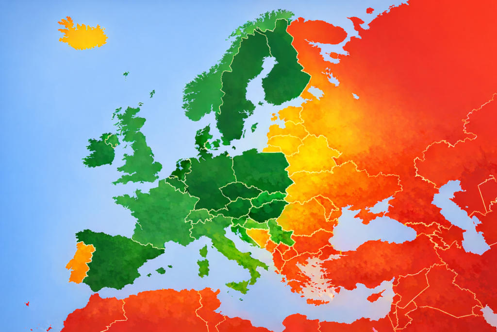 De laadpas van Eneco biedt een goede dekking in de groen gekleurde landen. Hier is 95% tot 99% van alle laadpunten te bedienen.